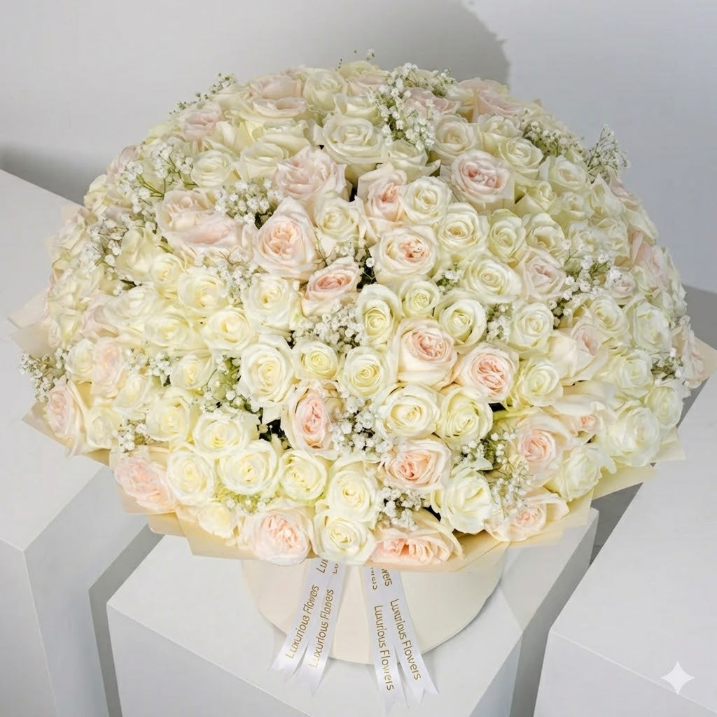 A graceful blend of premium O’Hara and White roses with Gypsophila, wrapped in our signature Grand style. Elegant and charming, it’s perfect for any occasion and sure to leave a lasting impression.