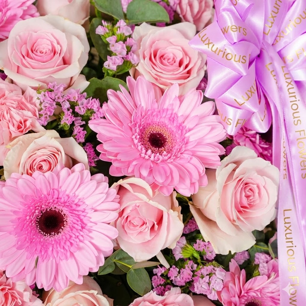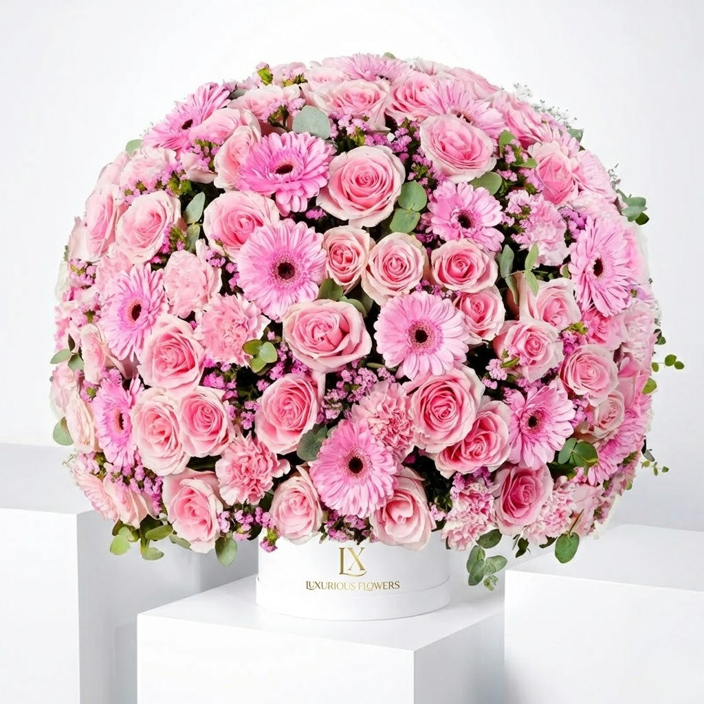 This stunning floral arrangement, nestled in a hatbox, features a lovely blend of pink roses, gerberas, carnations, and rose candy pink, accented with Statice Pink. A perfect choice for weddings, anniversaries, or any special occasion, offering a touch of elegance and sophistication.