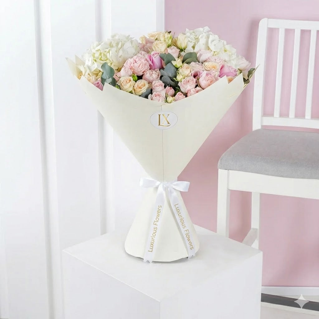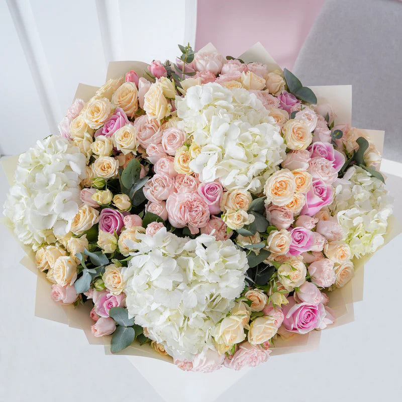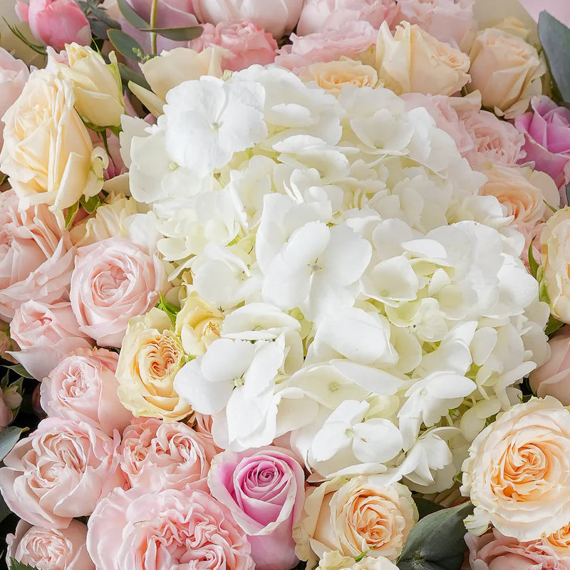 A soft, romantic mix of pink bombastic and light yellow selenora spray roses, paired with pink roses, fluffy white hydrangeas, and fresh eucalyptus. Elegant and timeless—perfect for any heartfelt occasion.