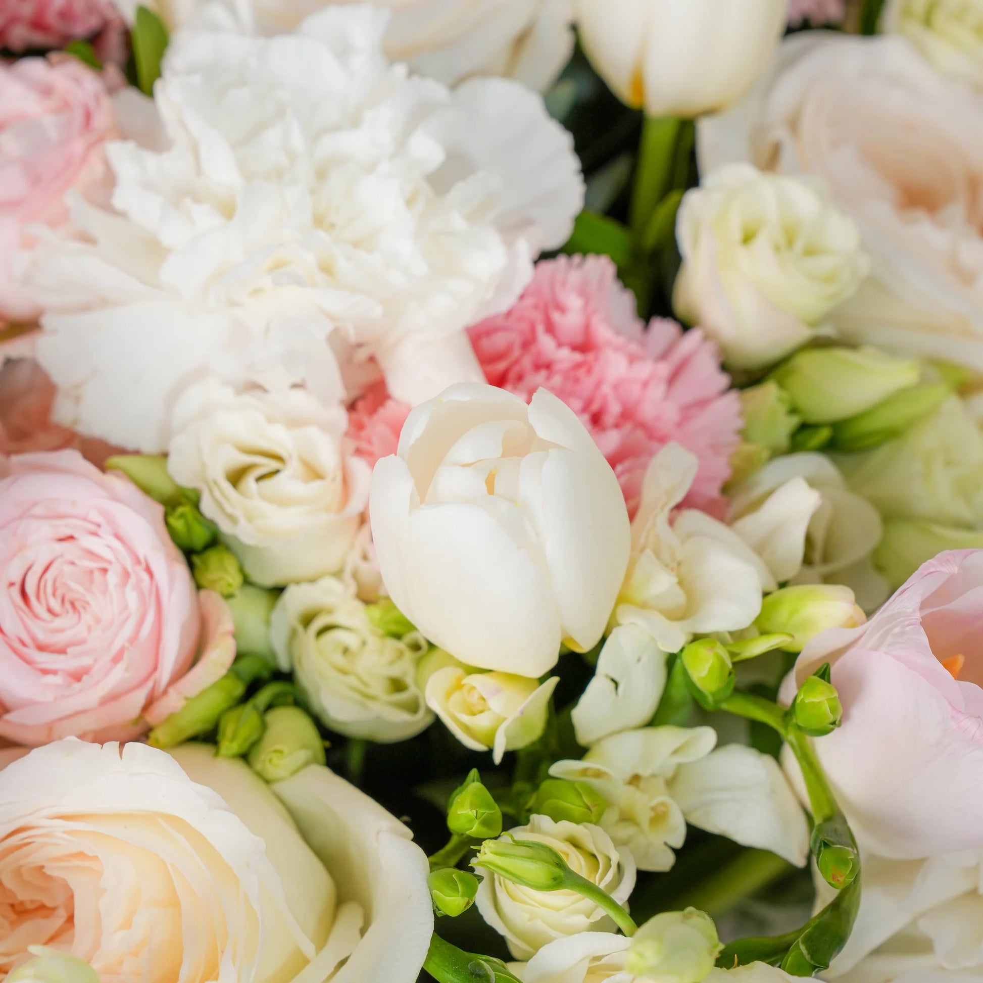 Delicate, dreamy, and effortlessly elegant, this soft-toned arrangement features pastel tulips, pale pink carnations, and soft roses. Accented with white freesia and lisianthus, this elegant arrangement is perfect for moments that call for a gentle and romantic gesture.