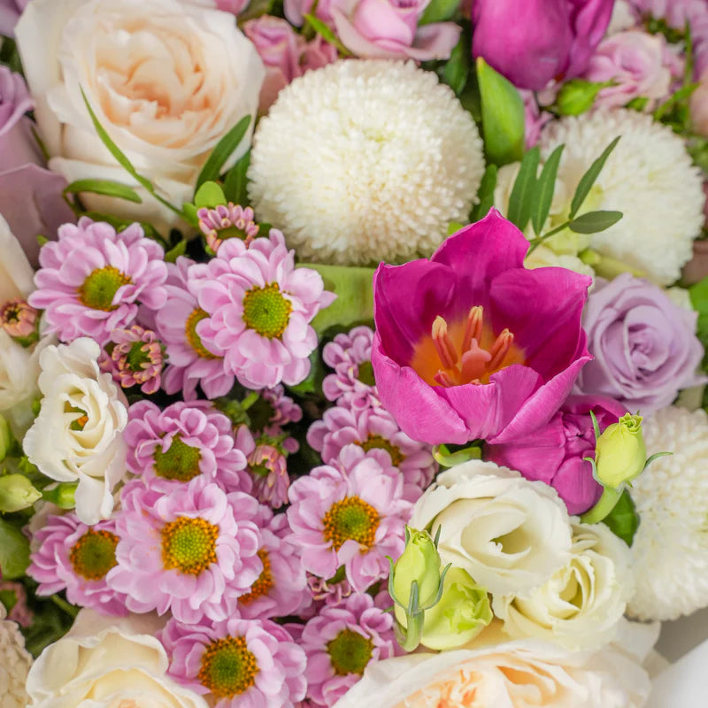 A soft and elegant blend of lilac and ivory tones, this arrangement brings a sense of graceful charm. Featuring elegant purple tulips, creamy white and soft lilac roses, it’s accented with airy white carnations, white ping pong blooms, and lavender-hued chrysanthemums. Perfect for moments that call for something subtle yet striking.